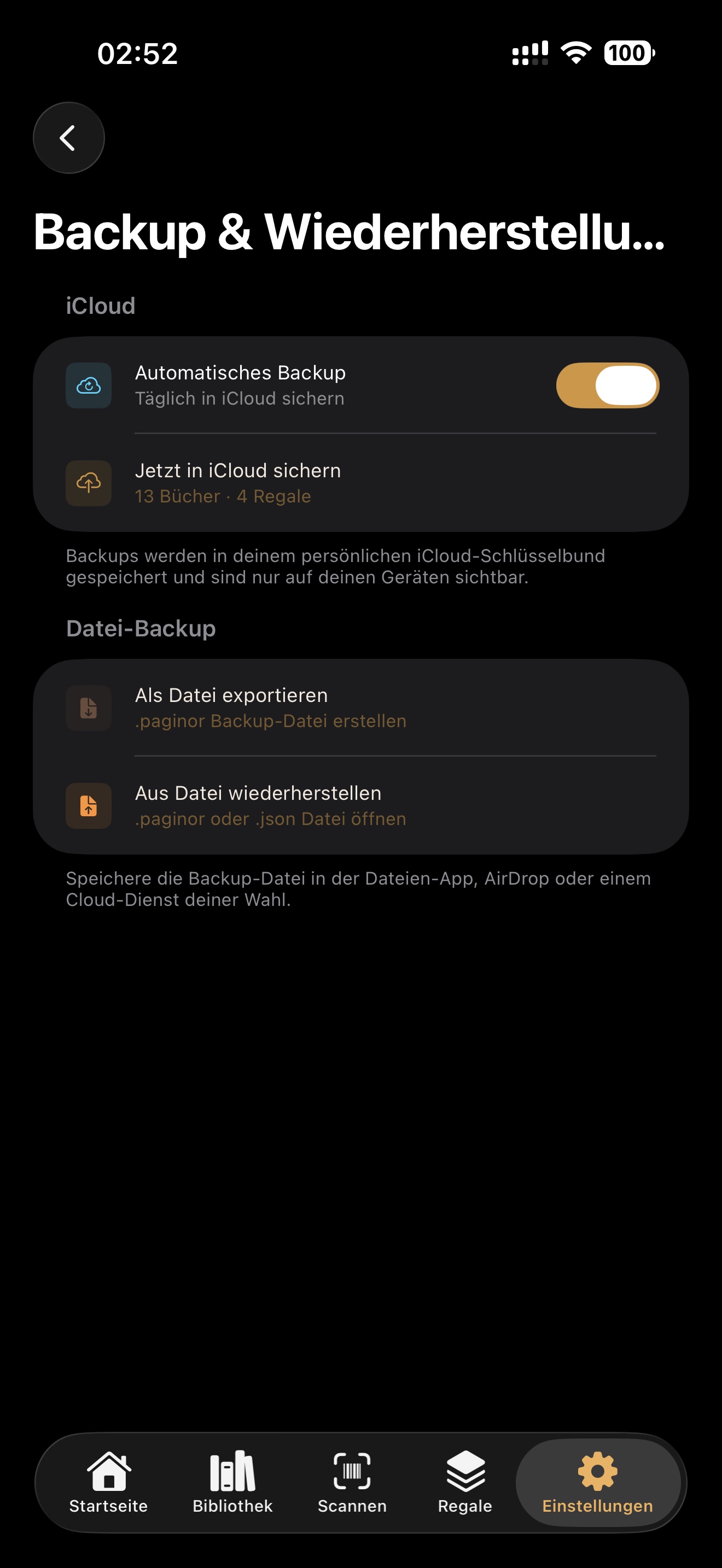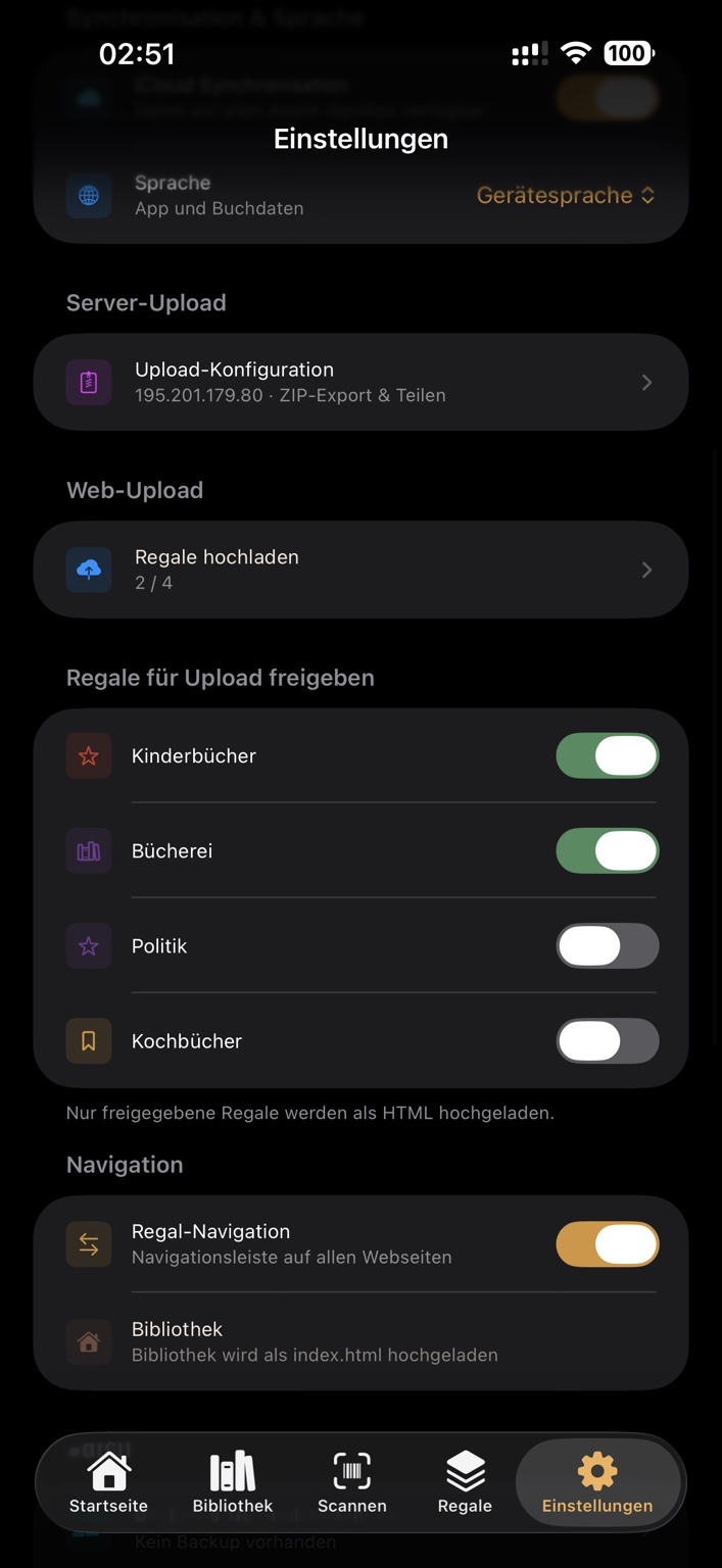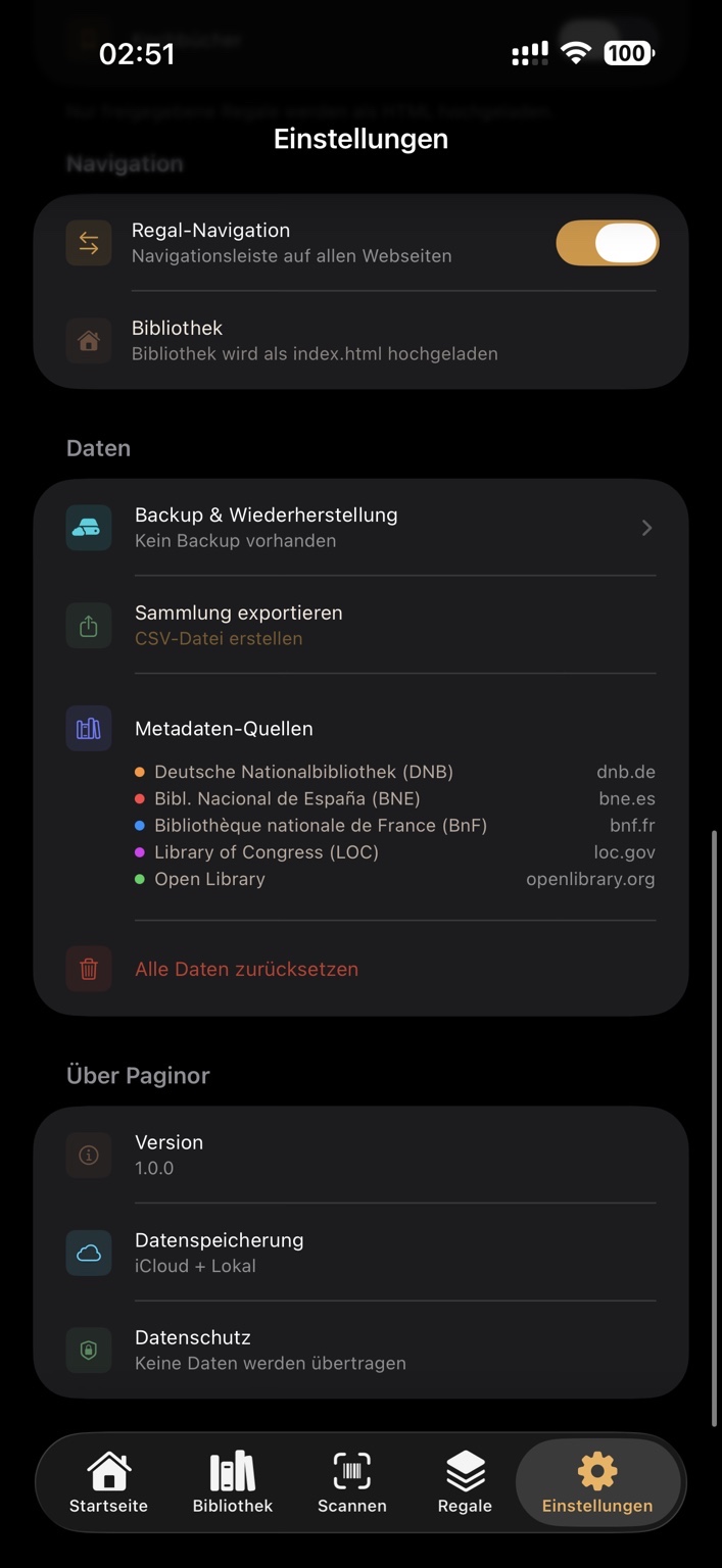 Paginor ist für private Nutzer konzipiert. Bücher lassen sich per Kamera oder ISBN erfassen, Regalen zuordnen, als Duplikat prüfen und bei Bedarf gezielt für eine Webansicht freigeben. Ergänzt wird das durch Synchronisation, Export sowie Backup- und Wiederherstellung.