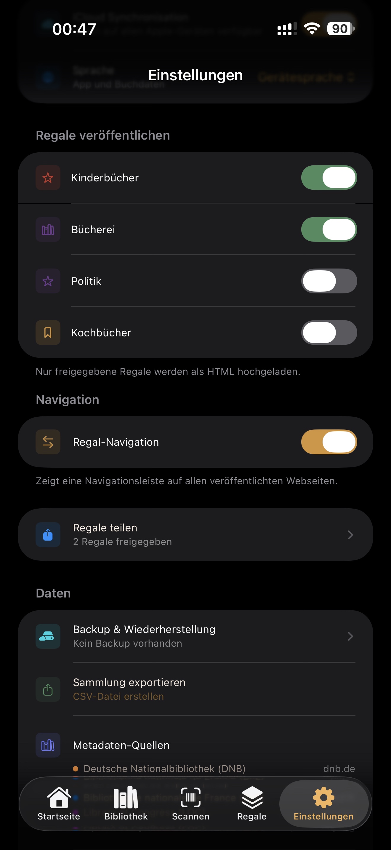 Die Einstellungen zeigen Datenverwaltung, CSV-Export, Metadatenquellen sowie Backup- und Wiederherstellung. Backups können automatisch in iCloud gespeichert, manuell erstellt oder als Datei exportiert und wieder eingelesen werden.