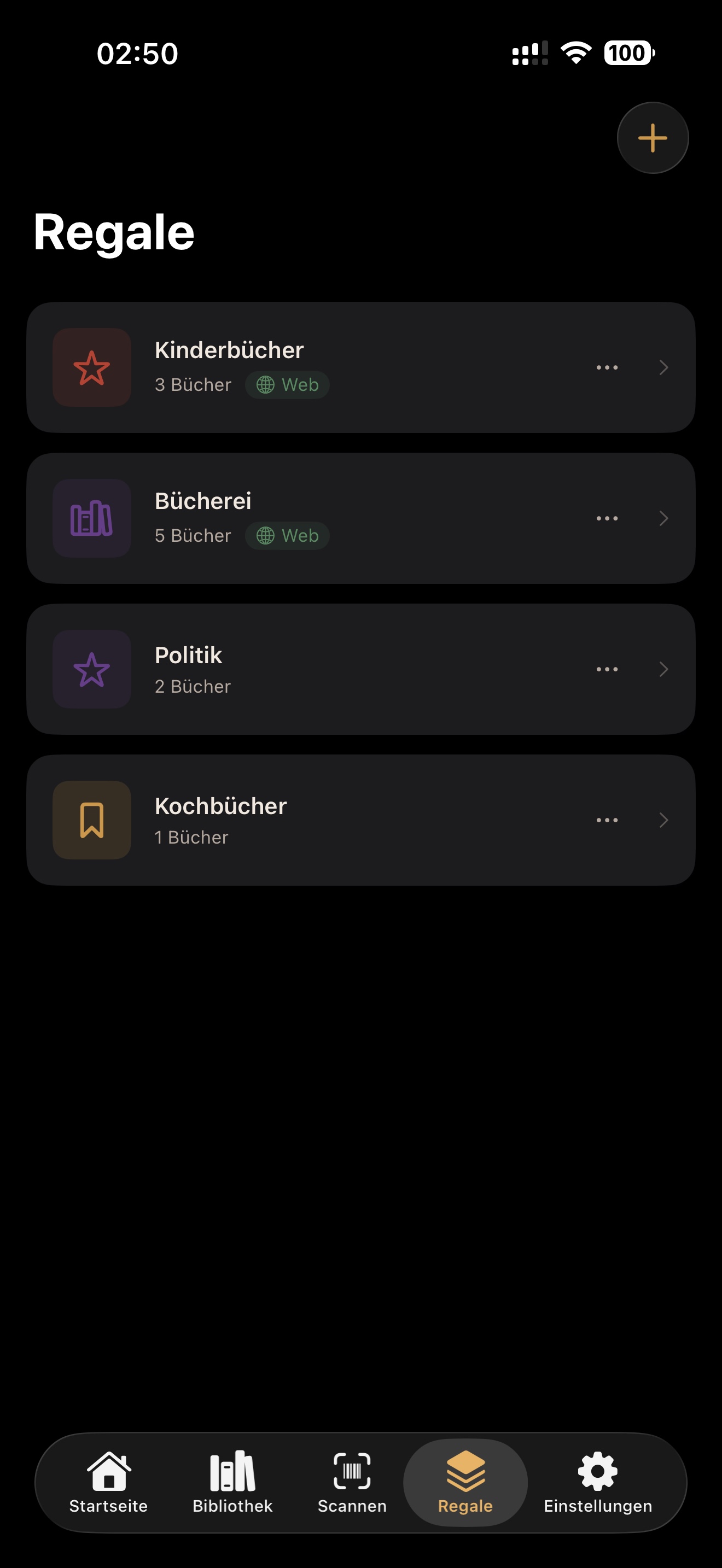 Regale besitzen Namen, Farben und Symbole. In der Übersicht werden Buchanzahl und Webstatus dargestellt.