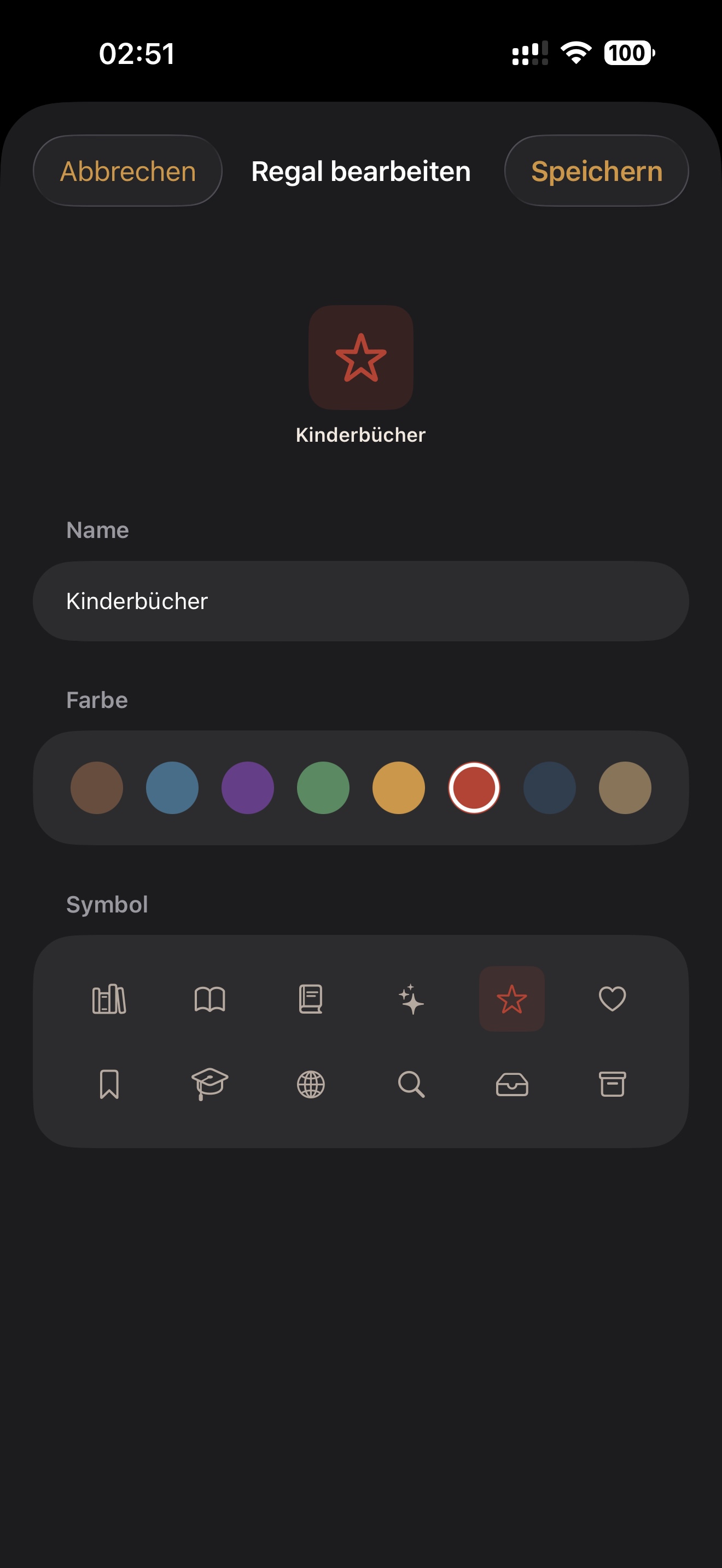 In der Regalübersicht werden Name, Anzahl und Webkennzeichnung angezeigt. Ein Regal kann über Name, Farbe und Symbol angepasst werden.