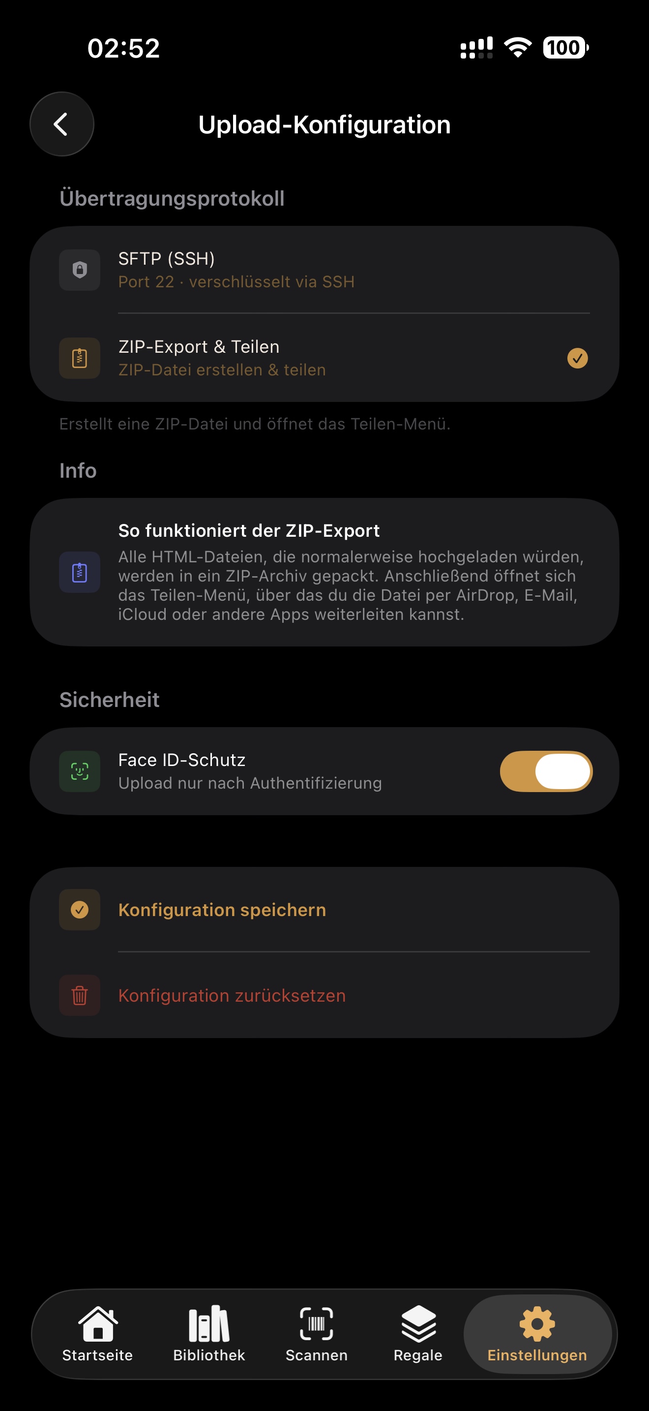 Freigegebene Regale werden als HTML veröffentlicht. Der Upload kann per SFTP erfolgen oder als ZIP-Archiv exportiert und geteilt werden.